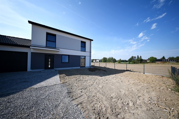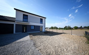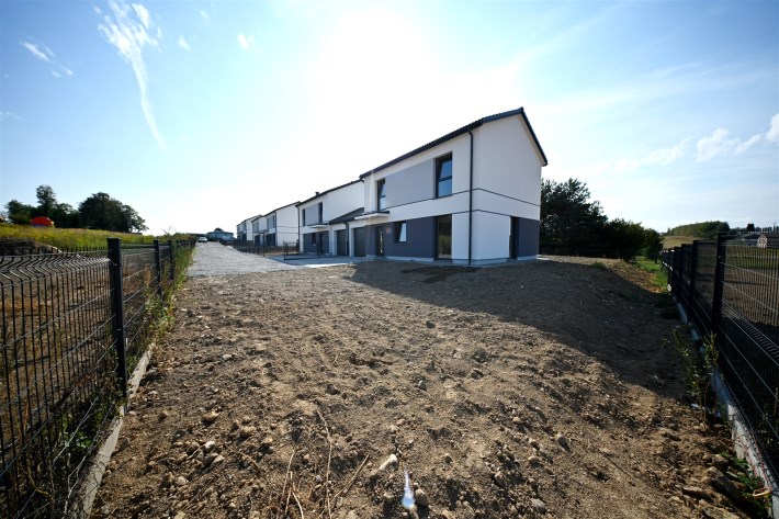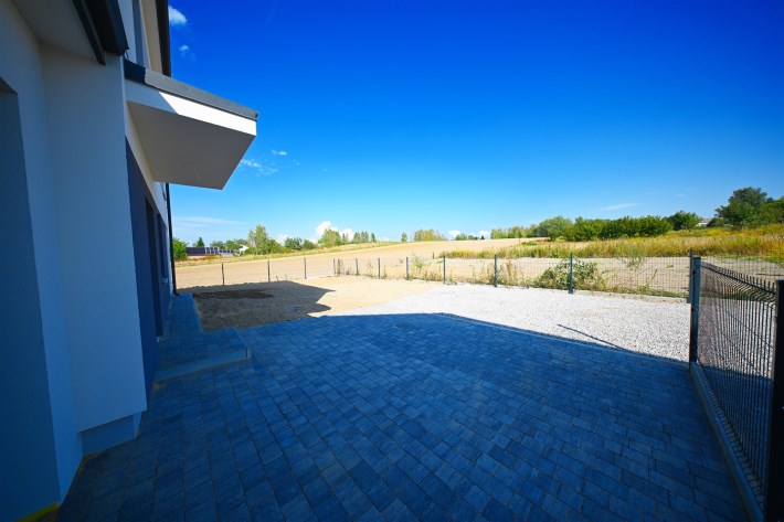 Cena budynku zawiera wybrukowany podjazd i taras kostką oraz ogrodzenie posesji.