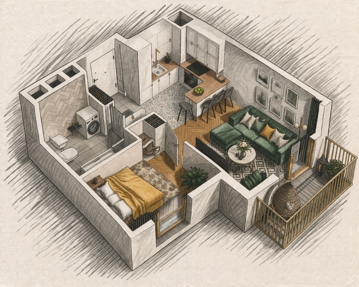 Już od progu uwagę przyciąga funkcjonalny układ pomieszczeń oraz balkon, z którego rozpościera się widok na piękne, kolorowe krajobrazy - miejsce idealne na poranną kawę lub wieczorny odpoczynek.