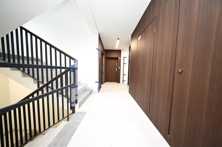 Nowoczesny budynek zaopatrzony w windy z dojazdem do poziomu -1 gdzie znajdują się miejsca postojowe i komórki lokatorskie .